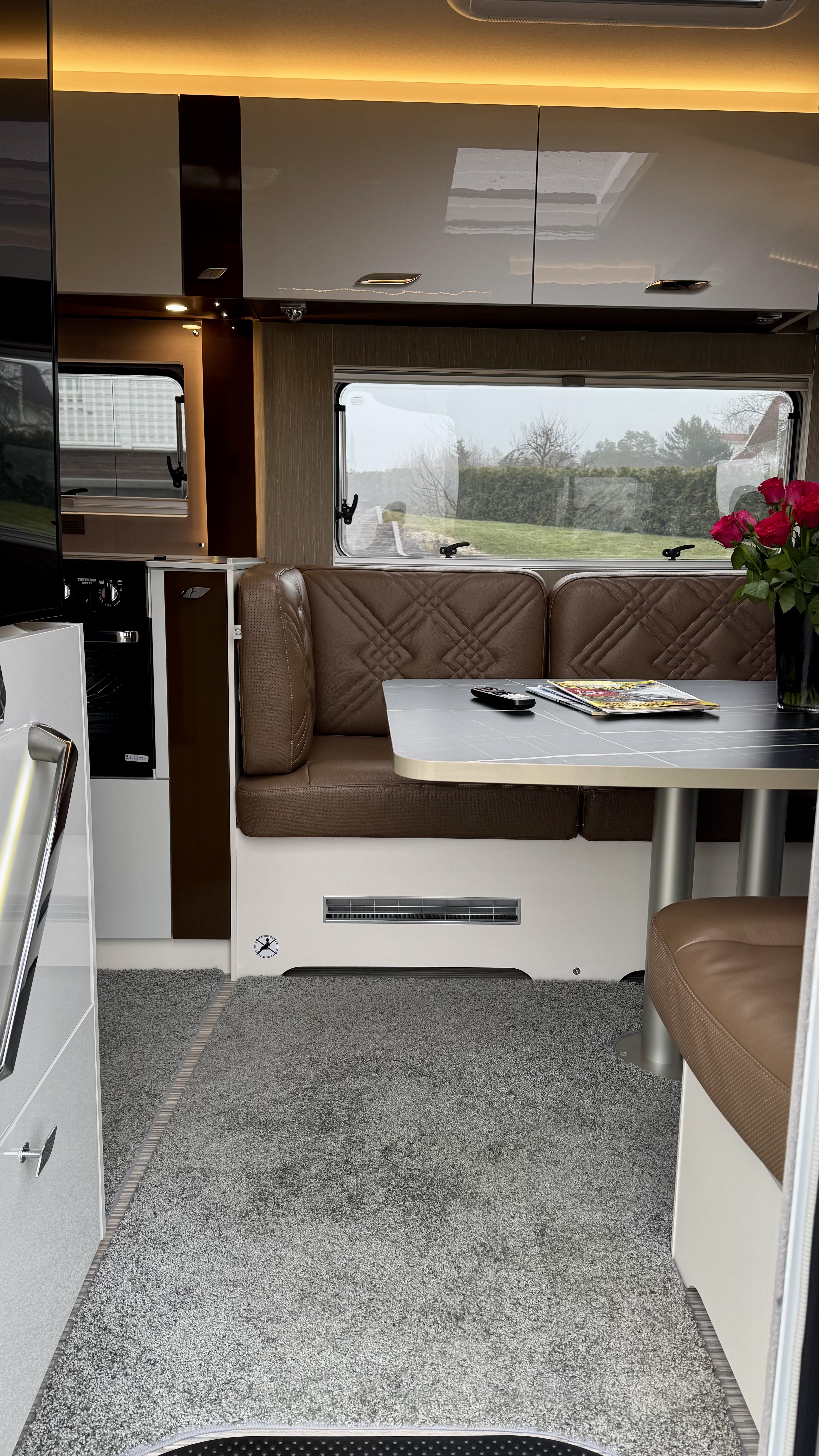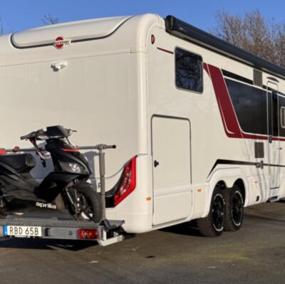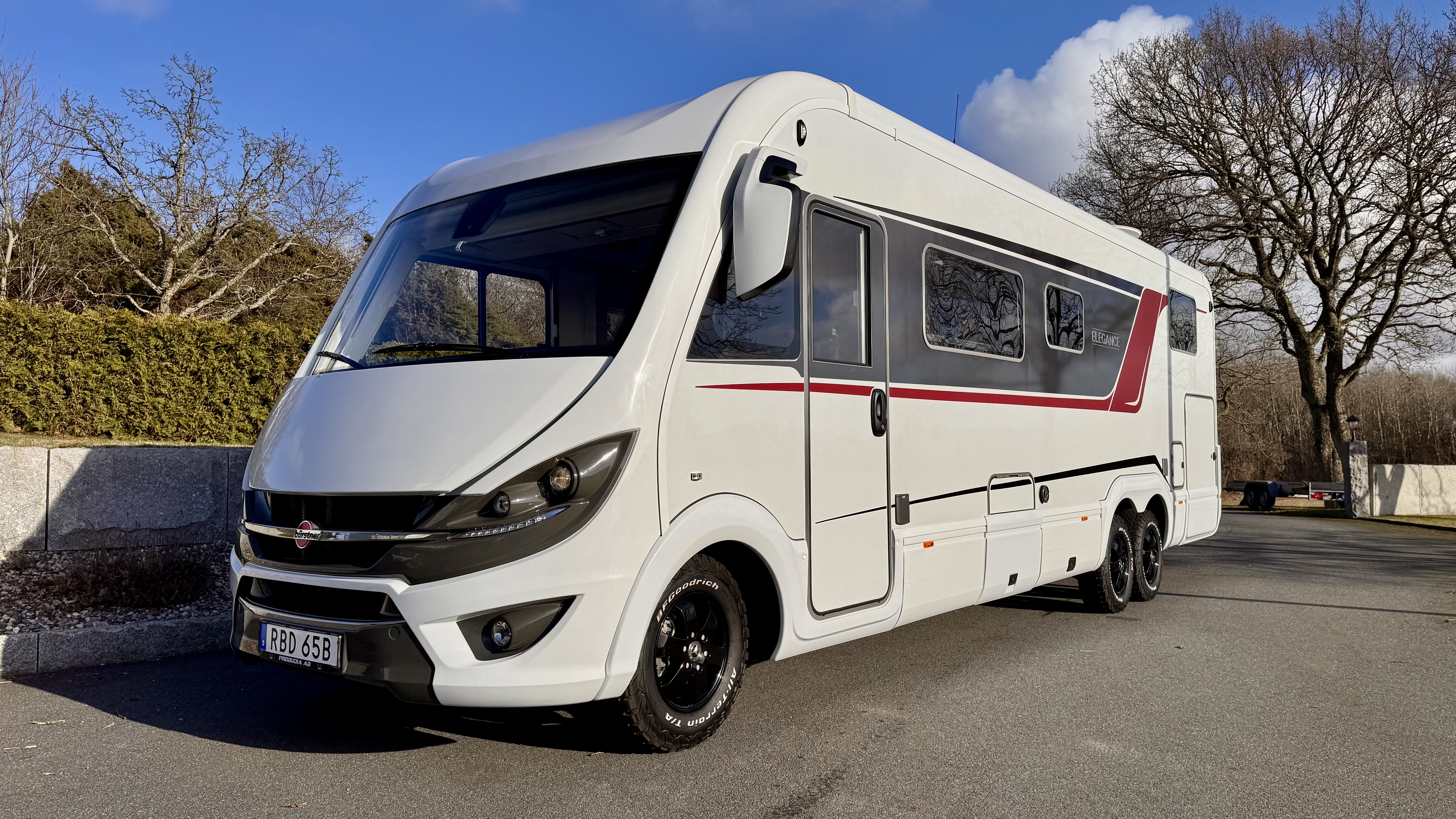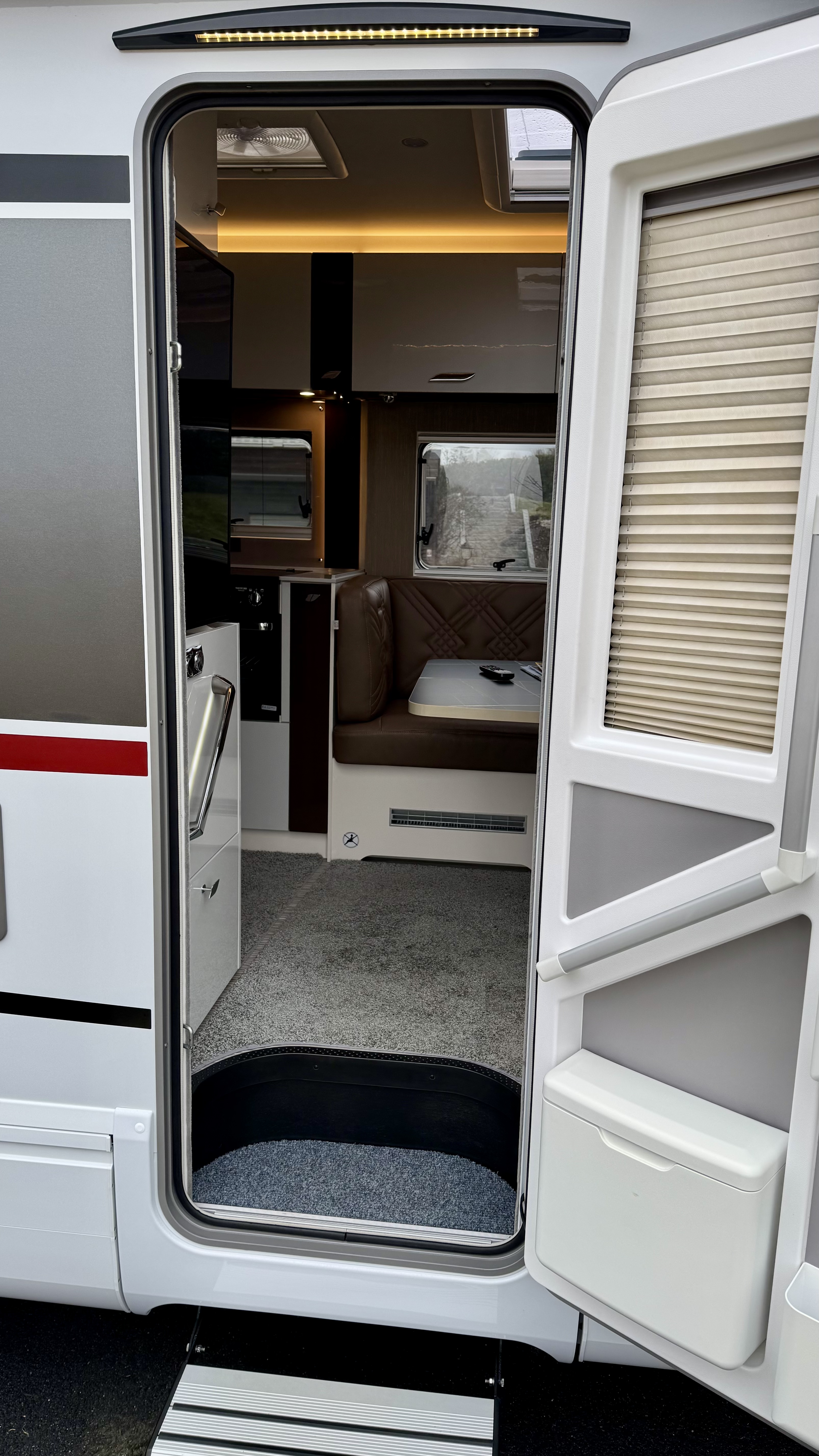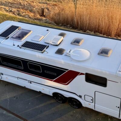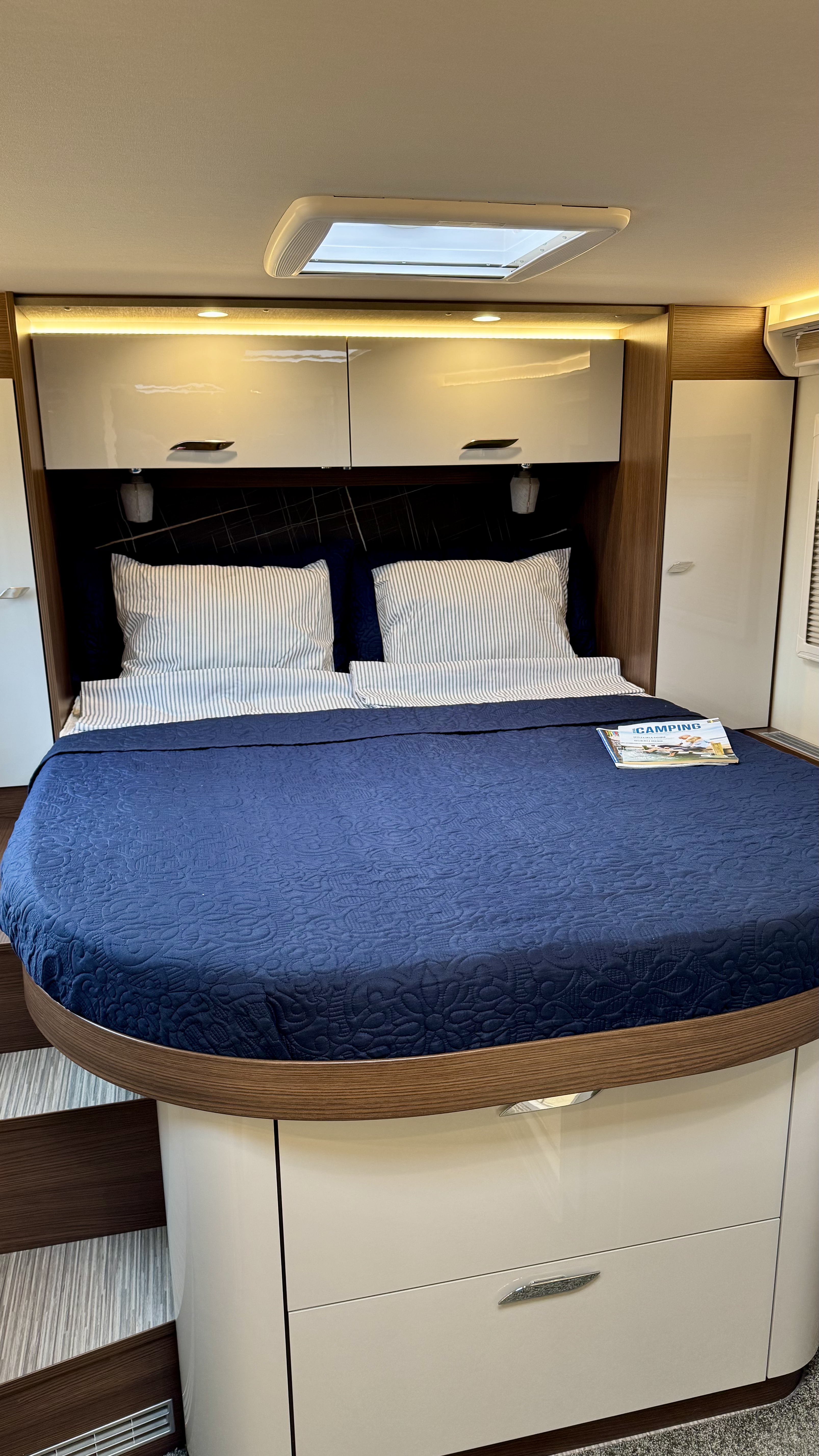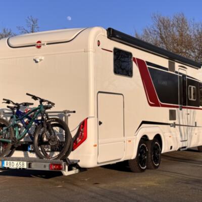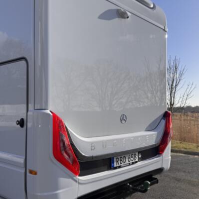 Detta är en otroligt välvårdad husbil i nyskick. Det går inte att hitta spår av användning. Finns inga repor, skavanker, bucklor, omlackeringar eller liknande. Rök & djurfri. Däcken är helt nya och ger husbilen ett mycket fräckare utseende. Det medföljer 2 mappar och pärmar fulla med instruktionsmanualer på allt som är installerat. Husbilen är helt fantastisk att köra tack vare Goldschmitt luftfjädring. Detta tillval gjordes vid första beställningen av husbilen. När husbilen står parkerad på ojämn campingplats så trycker man på automatisk nivellering så ställer sig husbilen helt rakt. Jag anser inte att hydrauliska stödben behövs när man har luftfjädring.