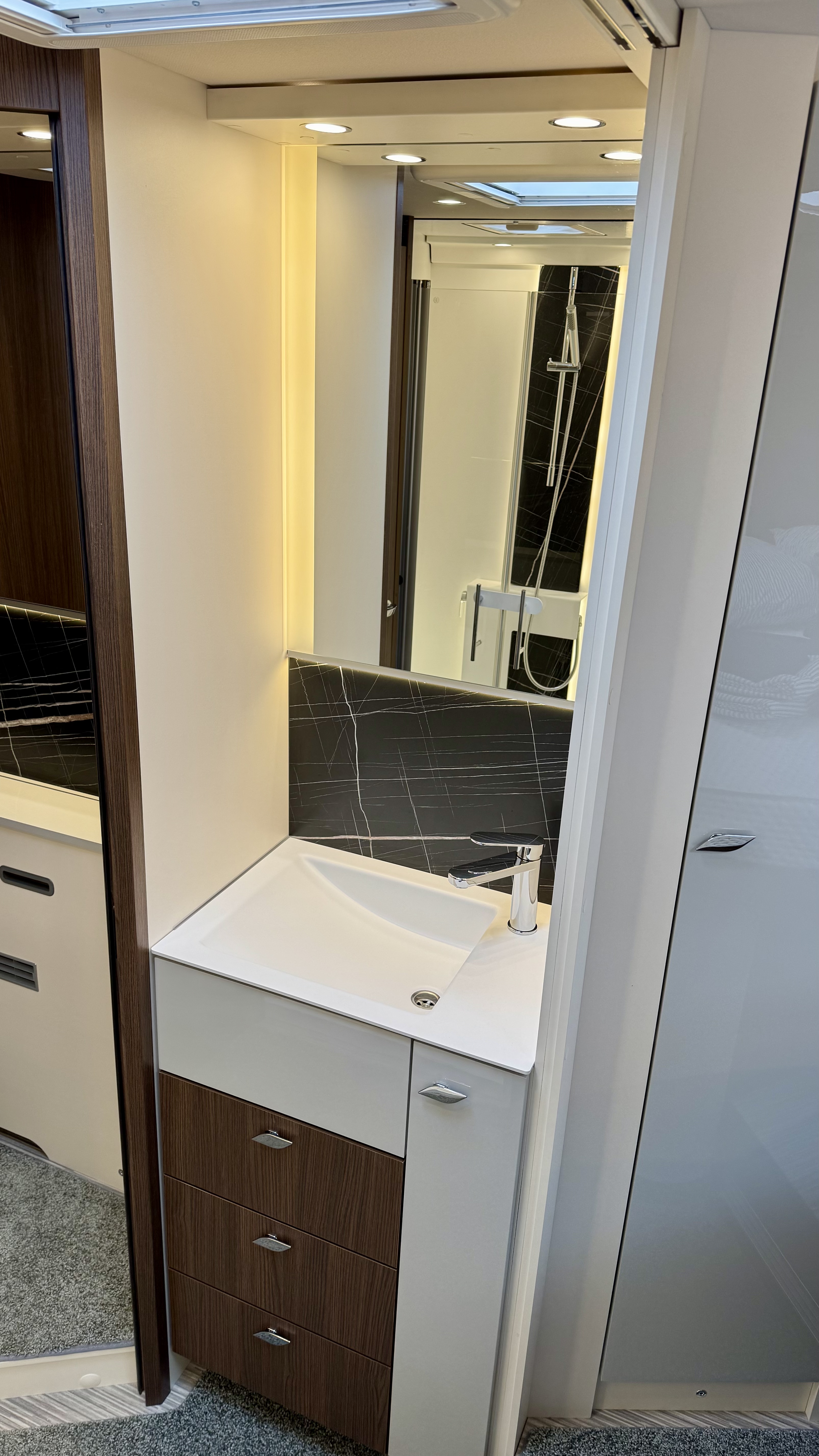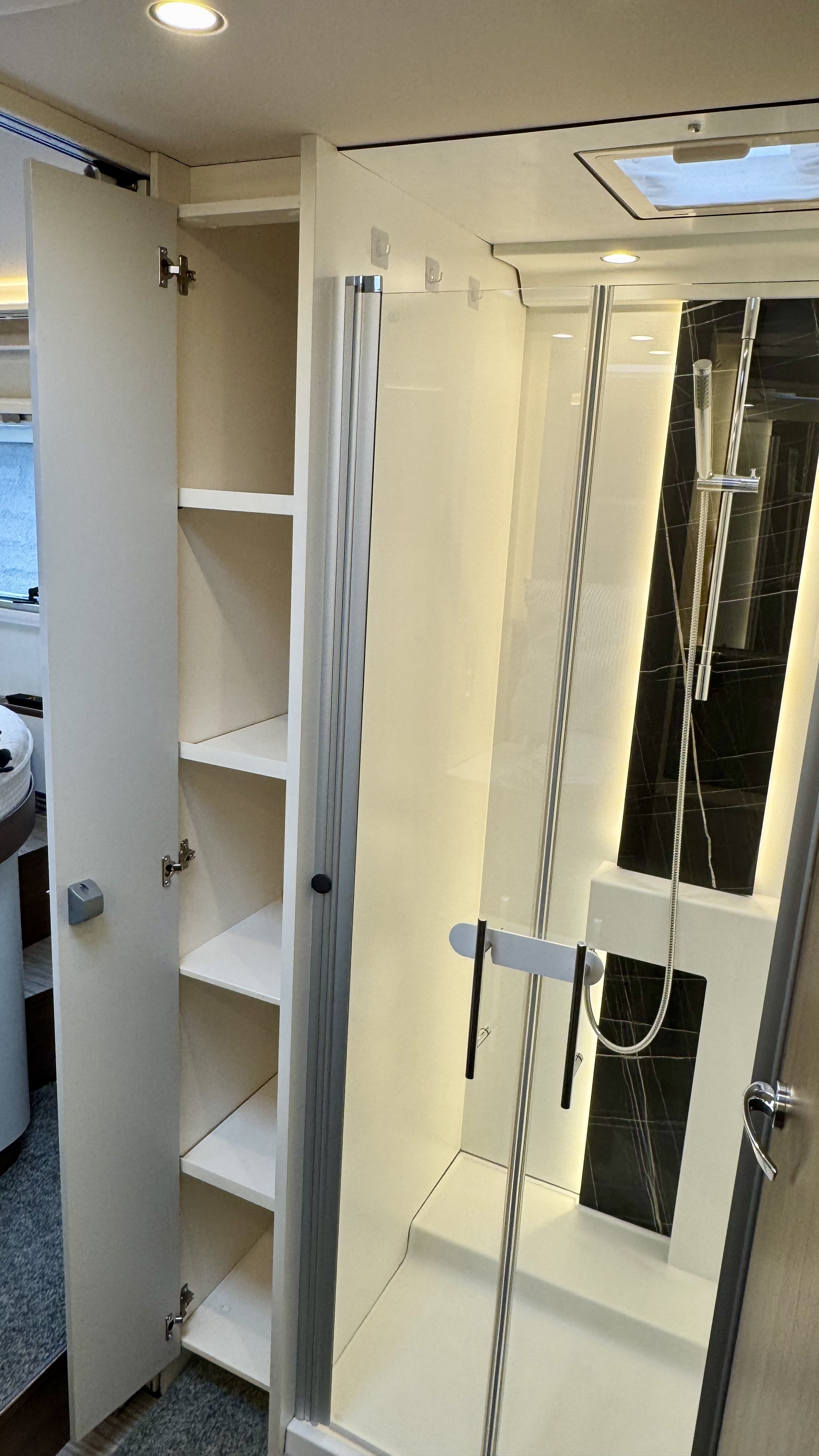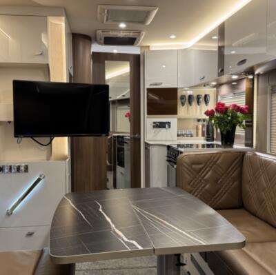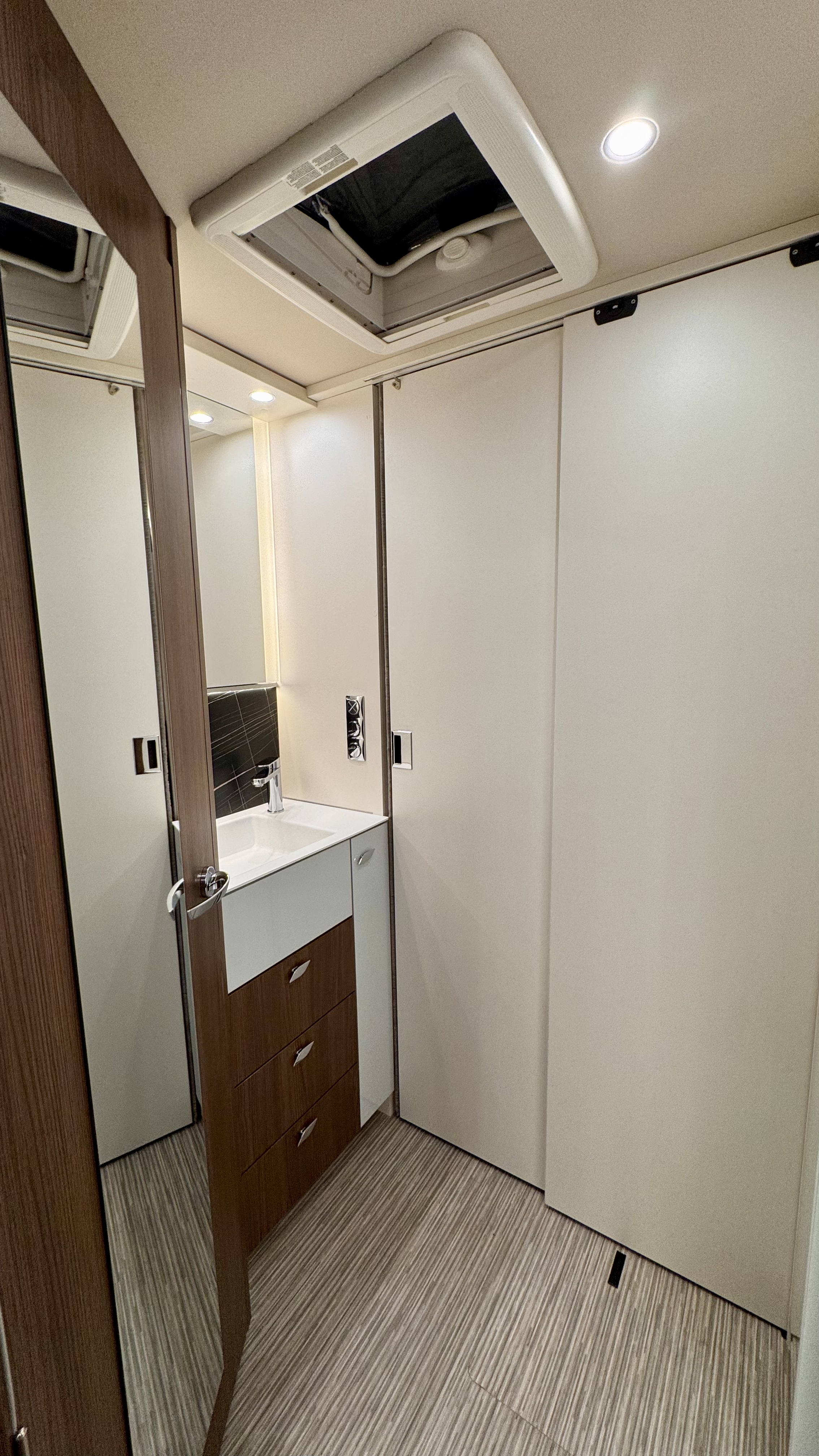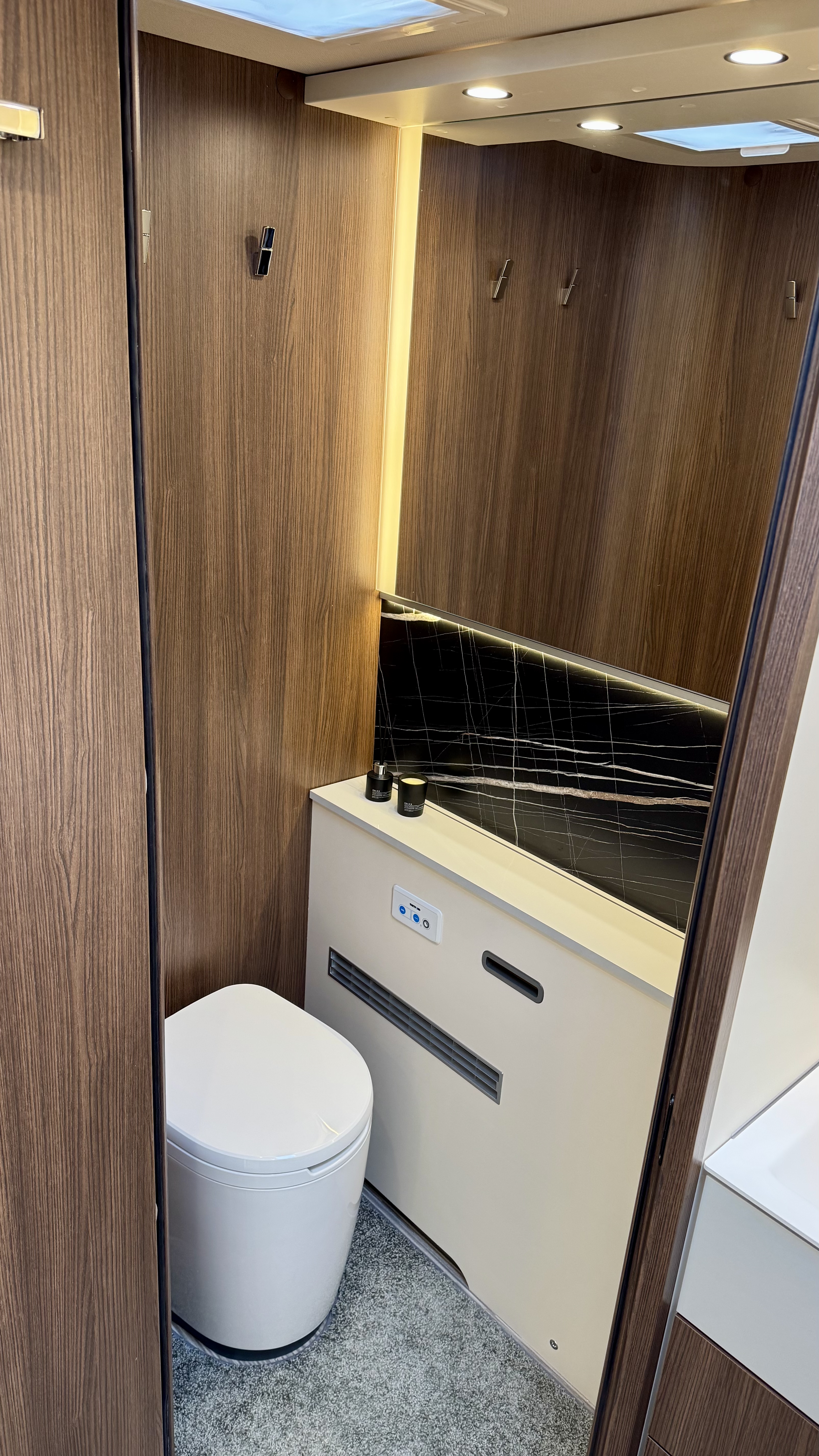 Detta är en otroligt välvårdad husbil i nyskick. Det går inte att hitta spår av användning. Finns inga repor, skavanker, bucklor, omlackeringar eller liknande. Rök & djurfri. Däcken är helt nya och ger husbilen ett mycket fräckare utseende. Det medföljer 2 mappar och pärmar fulla med instruktionsmanualer på allt som är installerat. Husbilen är helt fantastisk att köra tack vare Goldschmitt luftfjädring. Detta tillval gjordes vid första beställningen av husbilen. När husbilen står parkerad på ojämn campingplats så trycker man på automatisk nivellering så ställer sig husbilen helt rakt. Jag anser inte att hydrauliska stödben behövs när man har luftfjädring.