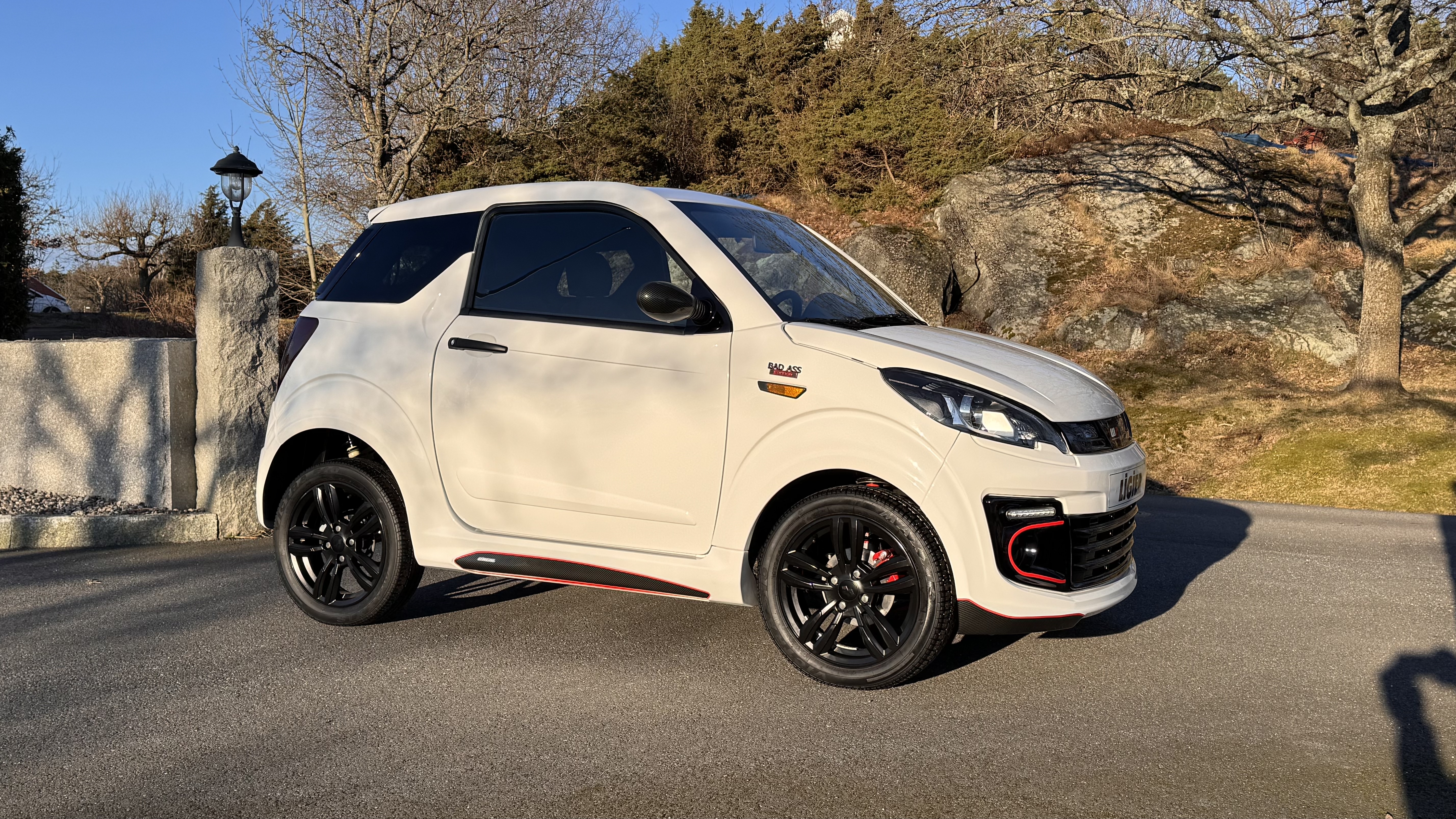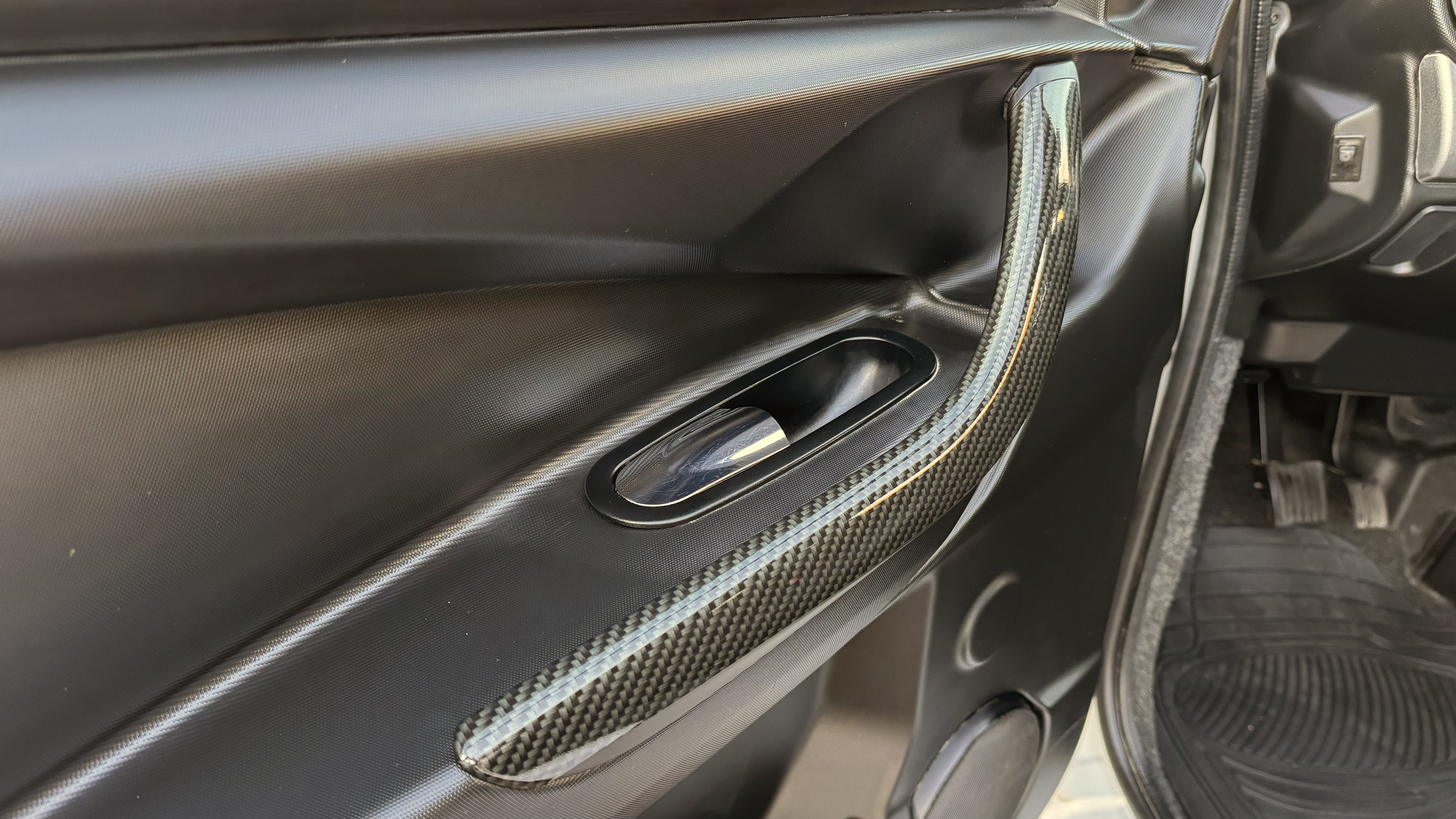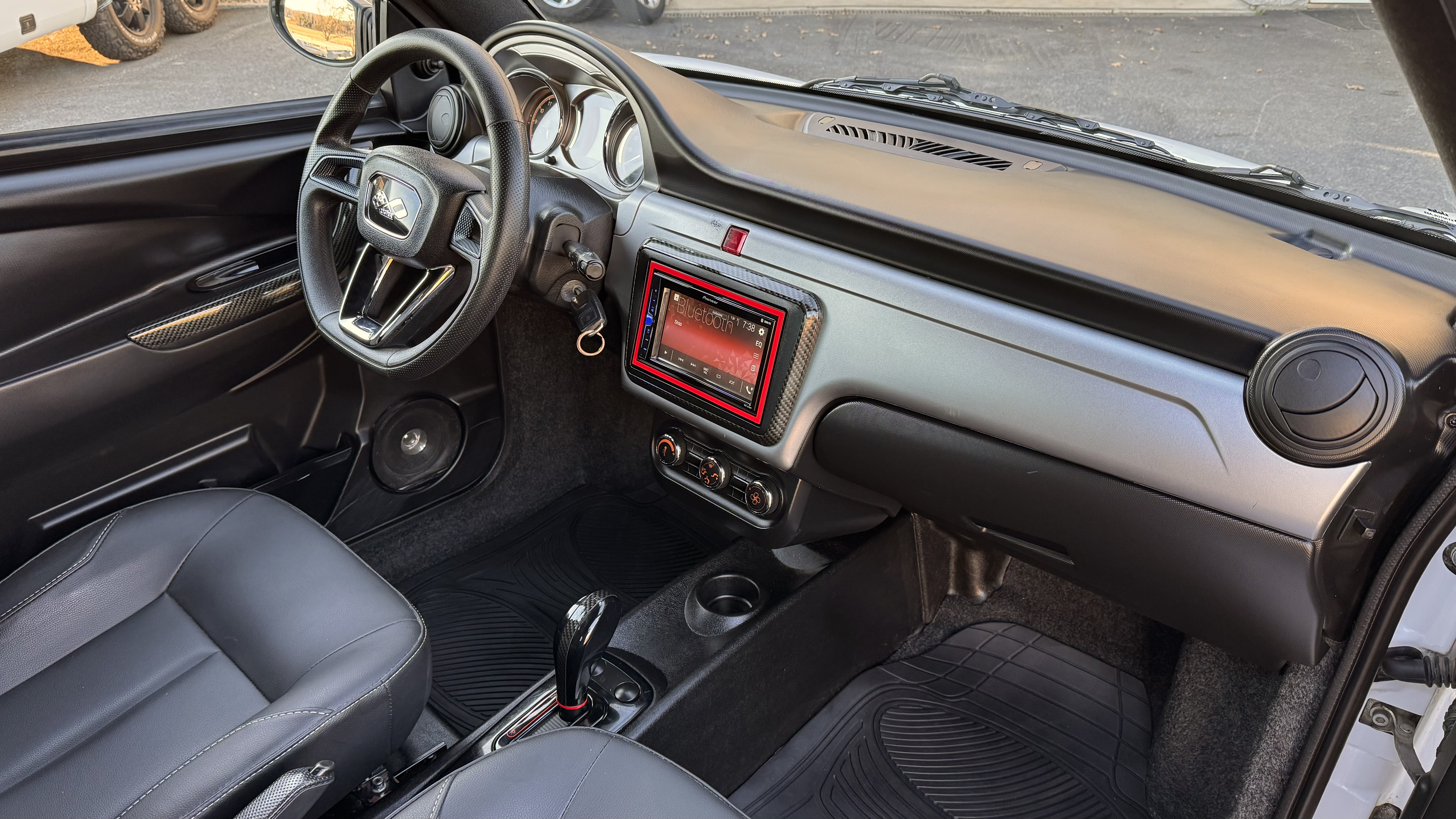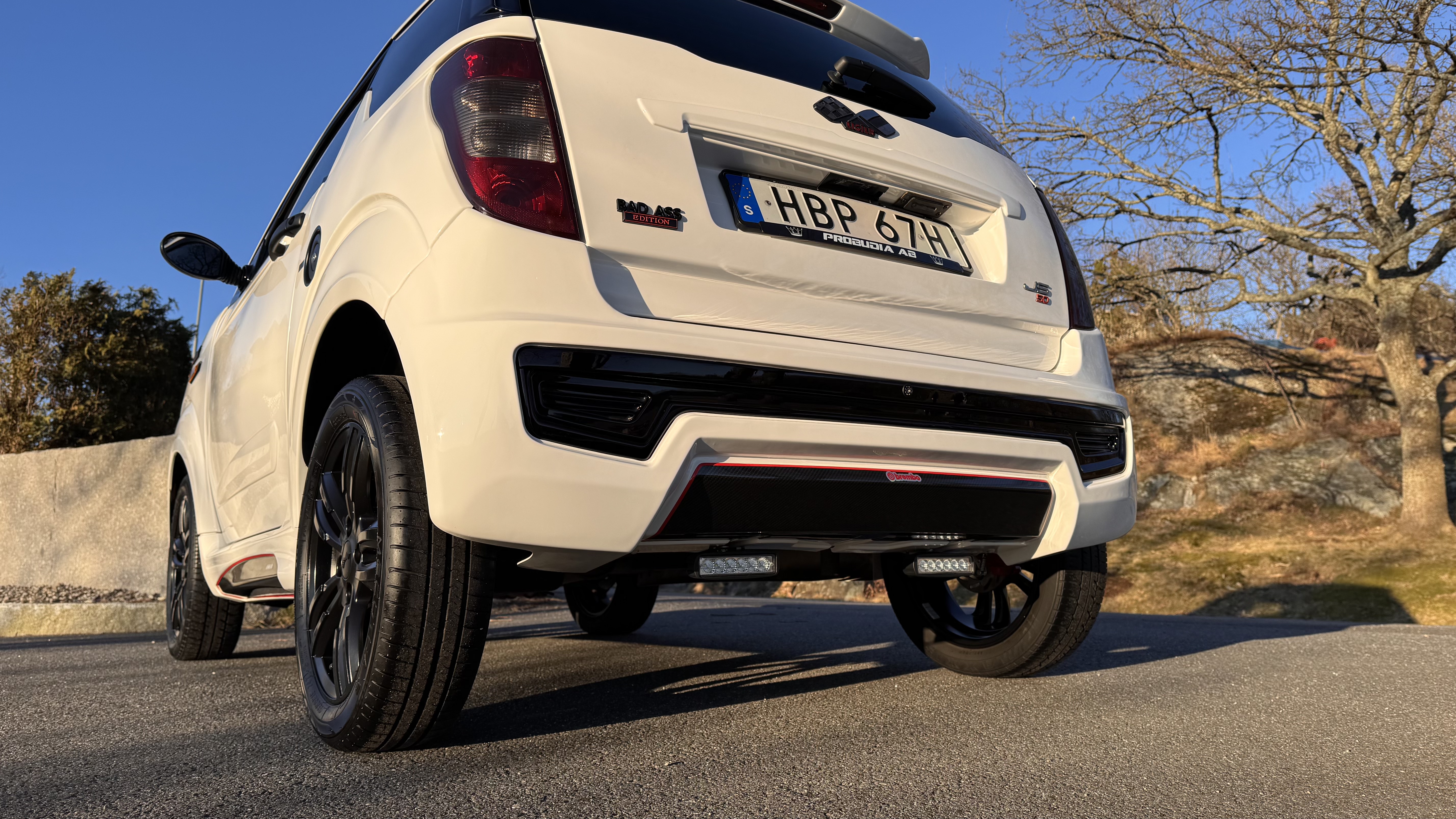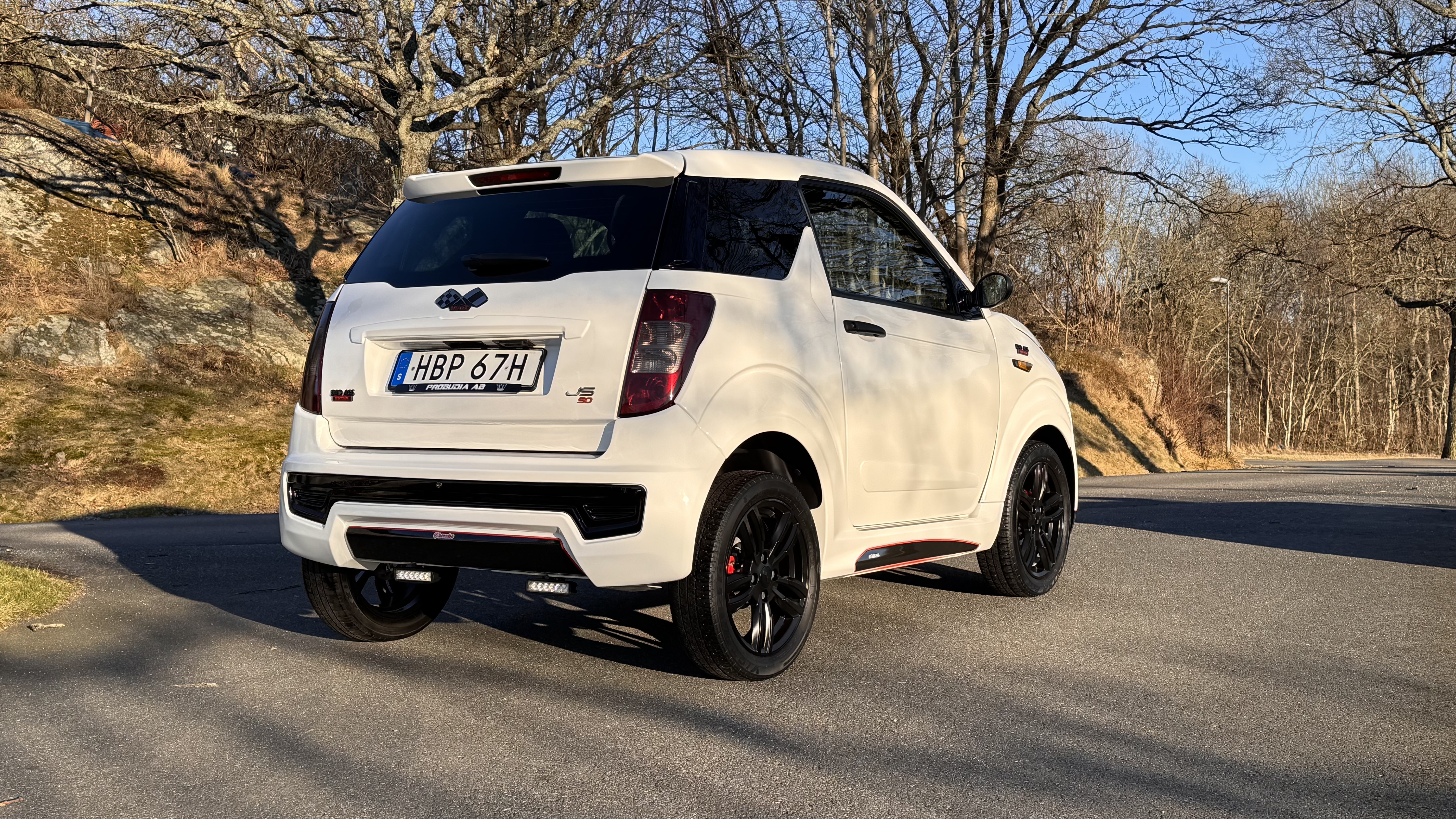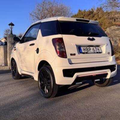 Biilen har fått ett sportigare utseende med kolfiber folie samt röda linjer, både interiör och